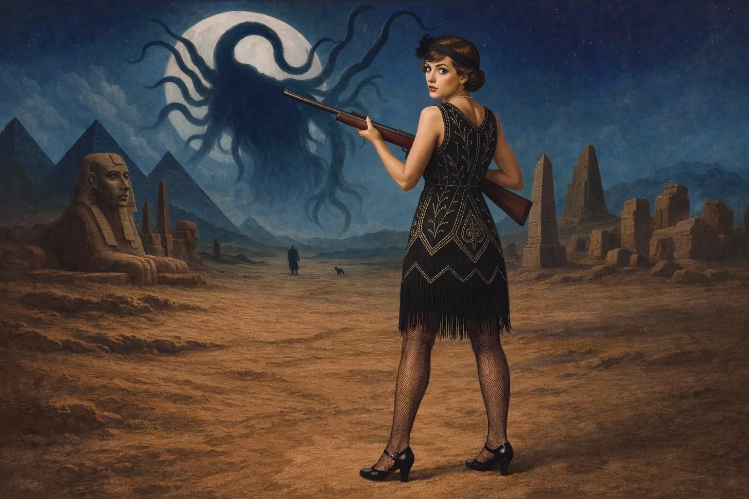 Doch geene droome kan ongeschonden blijven van haren Dromer. In de schaduw van dien eeuwigen sluimer verrees Nyarlathotep, de Kruipende Chaos, de Fluisteraer in de Duysternisse. Anders dan de stomme ende blinde oervaderen beweegt alleen hij zich met opzet door den droom. Hij is de stem der stemloozen, de wil der onwilligen, een schim van boosaerdigheid met duizend veranderlijke aanschijn. Hij wandelt de draden der droomen niet om te leiden, maer om te verdraaien, niet om te bouen, maer om te ontbinden, een meester van wanhoop wiens werktuygen de geesten der menschen zijn.