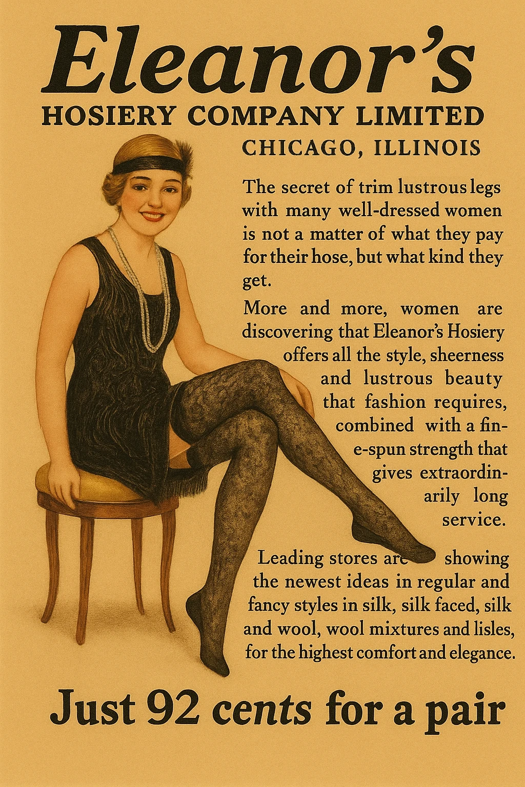 Welnu, op één van die avonden trad een heer op mij toe, met het soort zelfverzekerde glimlach dat mannen dragen wanneer zij menen dat zij een buitengewoon geestige opmerking gaan maken. Hij complimenteerde mij — let op, Eleanor — over mijn benen. En voordat ik mij zelfs maar kon afvragen of ik hem nu een tik met mijn waaier moest geven, verklaarde hij dat hij fotograaf is voor een firma die zijden netkousen vervaardigt.