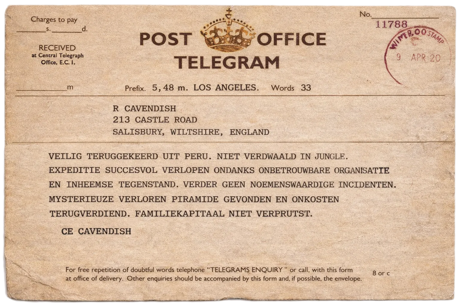 Ik heb derhalve besloten hem geen uitvoerige brief te schrijven, althans nog niet. In plaats daarvan achtte ik het verstandiger mijn thuiskomst kort en geruststellend te melden per telegram — bondig, fatsoenlijk, en vooral zó geformuleerd dat hij er geen aanleiding in zou vinden om onmiddellijk de halve Atlantische Oceaan over te willen varen om mij persoonlijk op te halen.