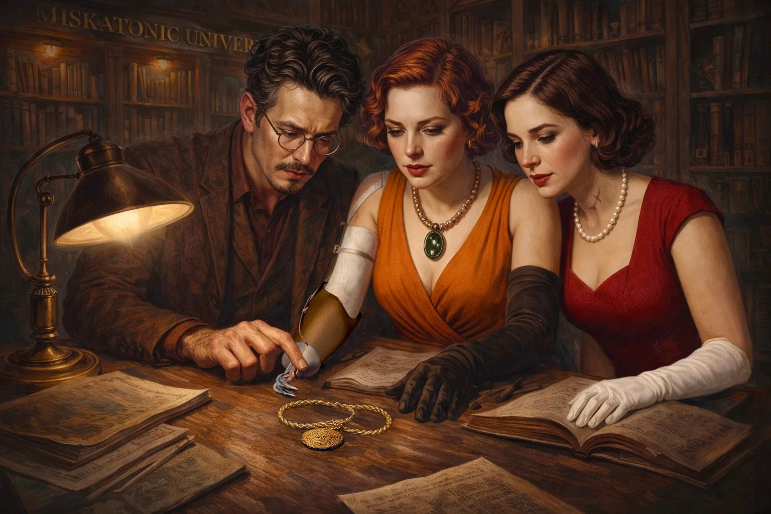 Johnathan stelde voor het amulet te laten onderzoeken in Arkham, waar hij woont en connecties onderhoudt. Zo kwamen wij terecht aan de Miskatonic University, waar wij — met enige moeite en de behulpzaamheid van een zekere professor Henry Armitage en een bijzonder vriendelijke bibliothecaresse, Mary, met rood haar gelijk bliksem uit de hemel — toegang verkregen tot een afgeschermde collectie van historische en occulte werken.