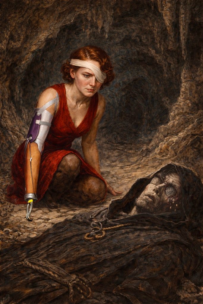 De vloer lag bezaaid met lichamen van cultisten. Opvallend was dat, ondanks hun verwondingen, er verdacht weinig bloed te zien was. Verschillende lichamen bleken ledematen te hebben die waren aangenaaid en al in verschillende staten van ontbinding waren. Tussen hen vond ik het lichaam van degene die mijn oog had gedragen. Dat leek met een onnatuurlijke snelheid te zijn weggerot in de schedel en er was niet veel meer van over dan een grauwe rottende bol.