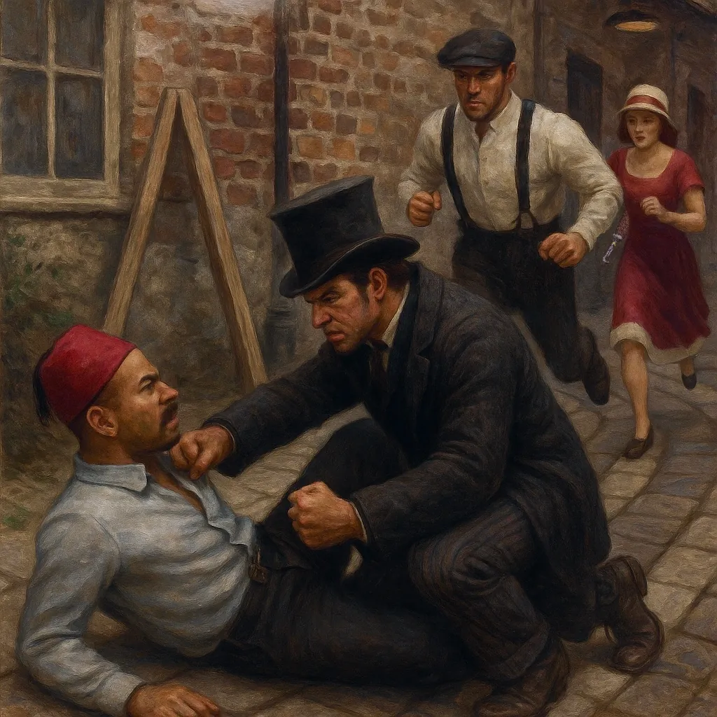 Hij was vlugger dan wij konden bevroeden. Het dragen van een jurk en hakken is natuurlijk niet ideaal voor een achtervolging, en mijn poging om hem middels magie tot stoppen te manen bleek tevergeefs. Gelukkig was Benjamin behendiger, en hij slaagde erin om de man te onderscheppen en te overmeesteren. Het werd echter al snel duidelijk dat er iets vreemds gaande was. In plaats van dat er een hevige worsteling ontstond, werd het opeens opvallend stil. Ik keek toe hoe Ben de Turkse man bij de keel greep om hem onder bedwang te krijgen, maar op dat moment verslapte het lichaam van de man en hield hij volledig op met bewegen. En toen gebeurde er iets onverklaarbaars: zijn gedaante en gezicht veranderden van die van de Oosterse man naar die van een wat oudere, gezette Engelsman. Bovendien bleek de man ook nog eens te zijn overleden.