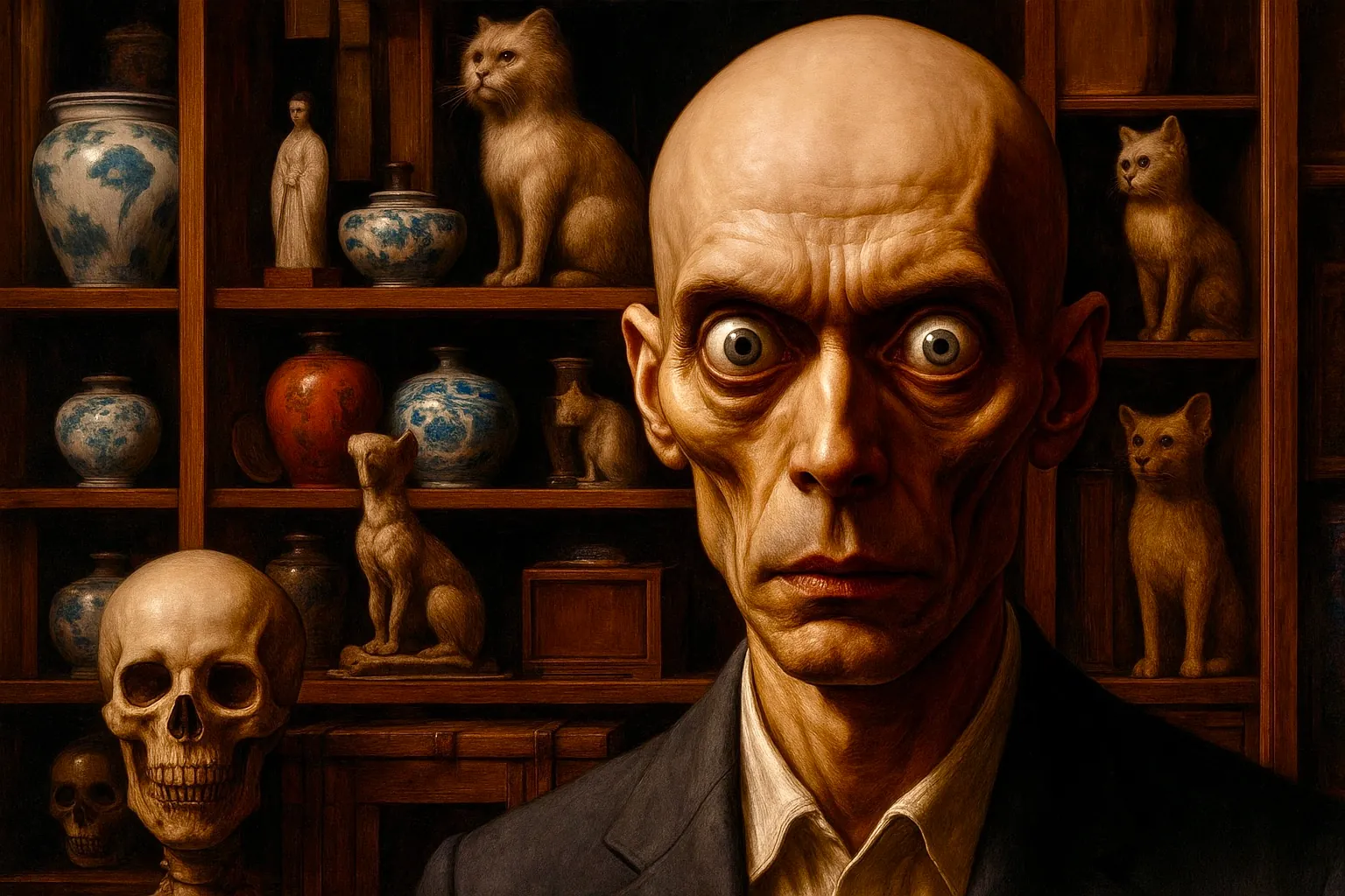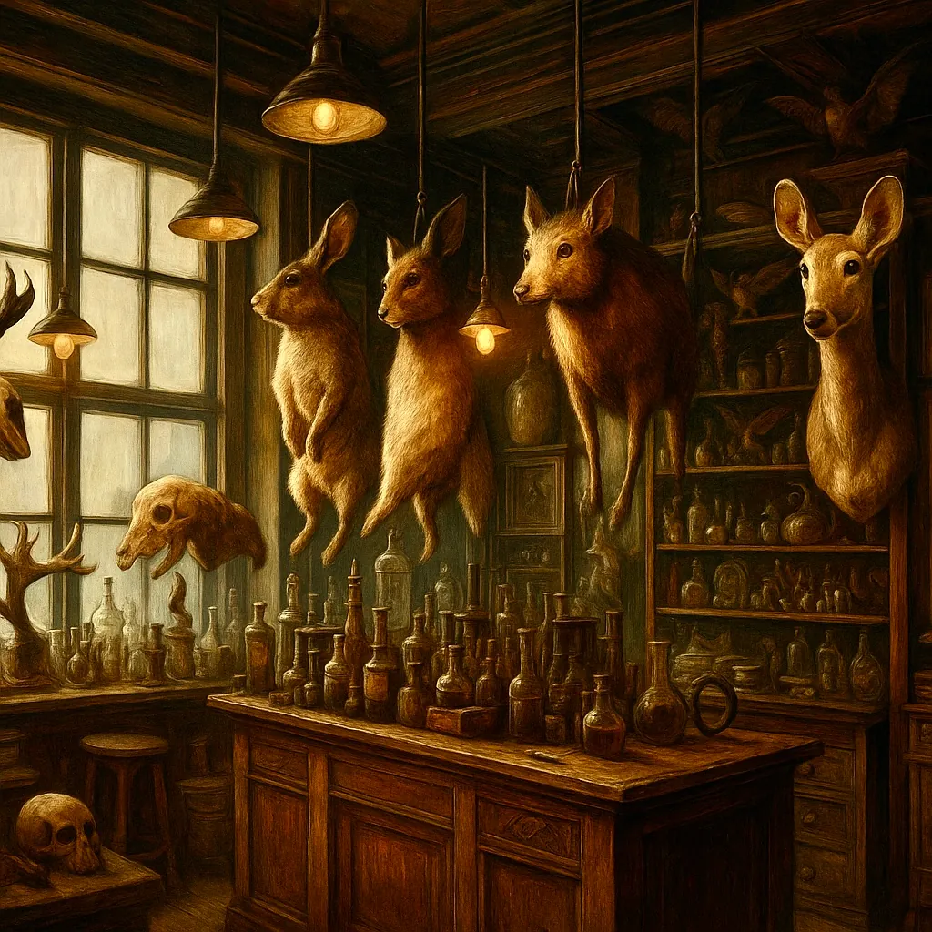 Bij het adres aangekomen belden we aan en werden vriendelijk begroet door Edgar, een keurige man van middelbare leeftijd die ons binnenliet in zijn winkel. Eenmaal binnen werden we overmand door een ongemakkelijk warm gestookt vertrek. Overal in de ruimte waren vele soorten dieren uitgestald als een vervreemdende, bijna absurde expositie. De ruimte stond vol met ornamenten met gedroogde bloemen en kruiden, die niet konden verhullen dat daaronder de bedwelmende geur hing van rottend vlees, vochtige huiden en formaldehyde.