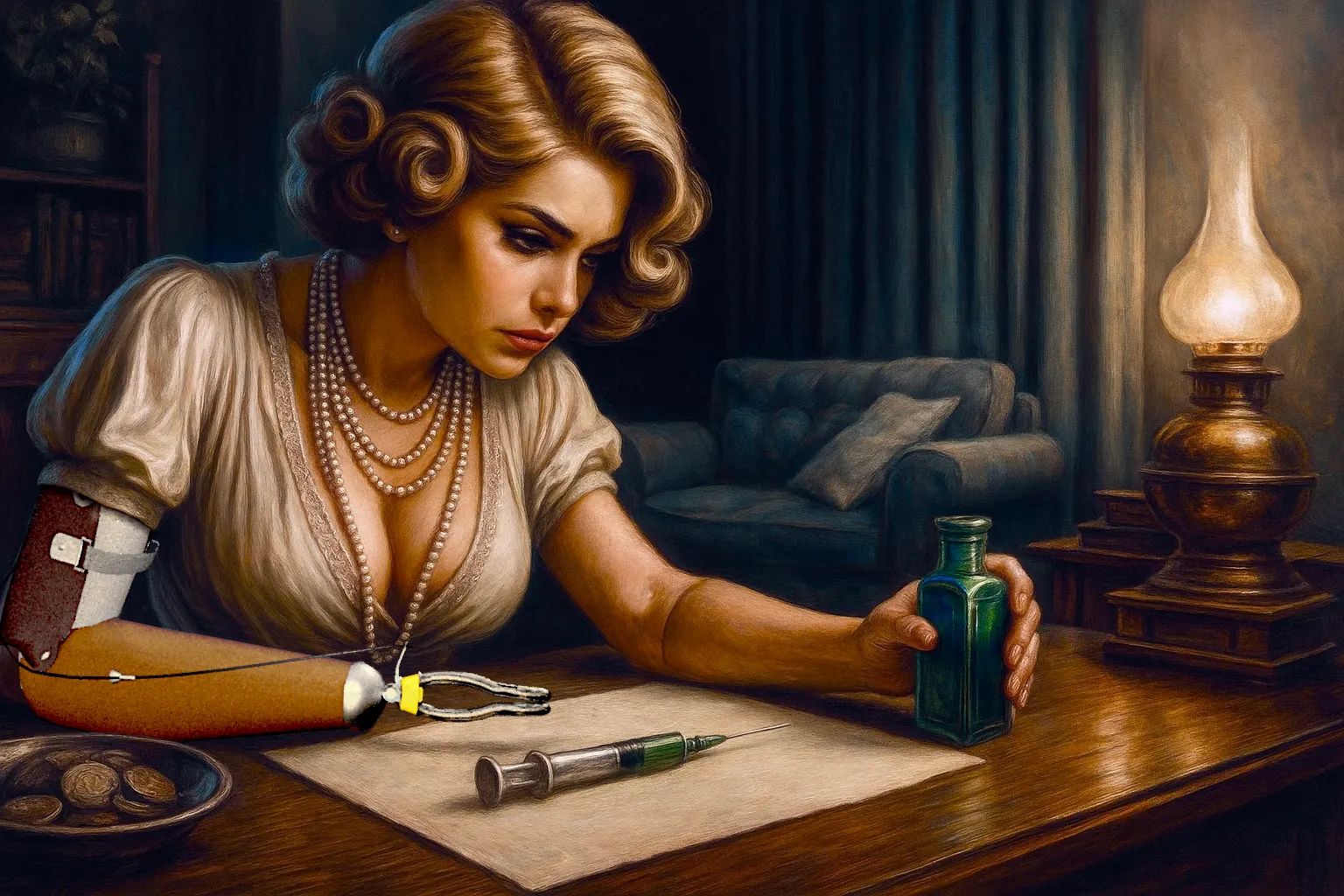 Ik schrijf dit op mijn hotelkamer, in afwachting van Klaus, die mij dadelijk zal komen vergezellen om onze plannen hier in Milaan verder uiteen te zetten. Van iedere treinreis wordt een mens toch wat stoffig en muf en daarom is het zojuist genoten bad in het hotel altijd een verkwikkende activiteit waar ik naar uitkijk. Terwijl ik daarna bezig was mij weer aan te kleden, viel mijn oog op het groene flesje met het label ‘Droom-Lausanne’ dat ik op tafel had gezet. Na onze aanvaring met de Hertog in de trein is voor mij de urgentie om de scroll van Edgar Wellington te vinden dramatisch toegenomen. En die scroll vinden we vrijwel zeker niet hier in onze fysieke wereld. We zullen daarvoor moeten afreizen naar de wereld der dromen. En om daar te komen zullen we de ranzige, dubieuze substantie in het flesje tot ons moeten nemen. Dat maakt me huiverachtig. Moeten we dit met een naald in onze aderen spuiten, gelijk morfine of heroine? Is dat hoe Edgar de droomwereld betrad?