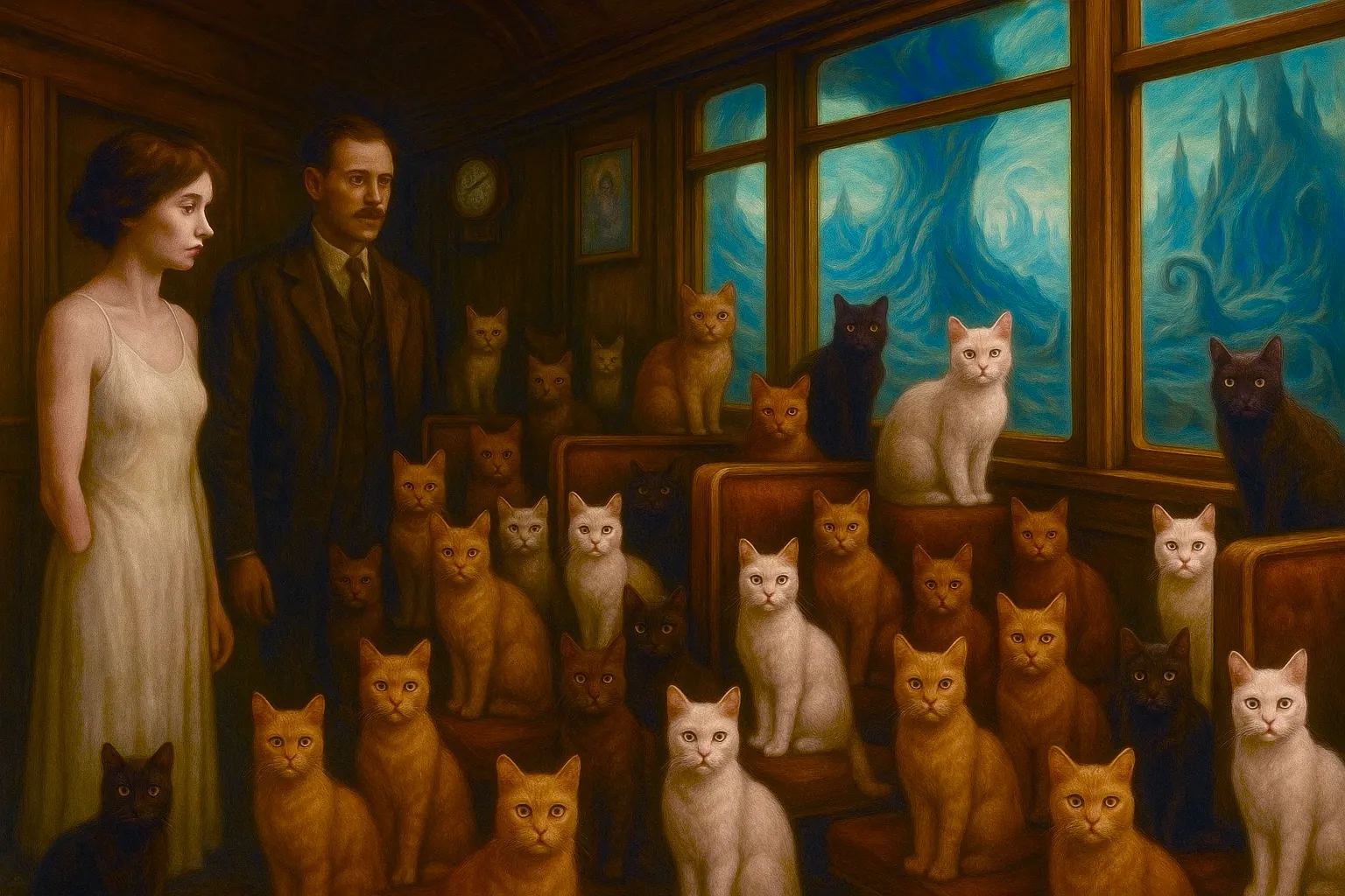 Onze cabine was zoals we het hadden achtergelaten, inclusief het levenloze lichaam van de kat Blackjack. Door messteken om het leven gebracht. Henri Peeters, de immer vriendelijke conducteur, was zichtbaar van streek. Zijn gezicht verbleekte bij het zien van het dier. Een vermoorde kat aan boord van deze trein… dat zou ernstige repercussies hebben, vooral in Ulthar. Hij vroeg, of liever gezegd smeekte ons om hem te helpen de dader te ontmaskeren. Uiteraard stemden wij toe.