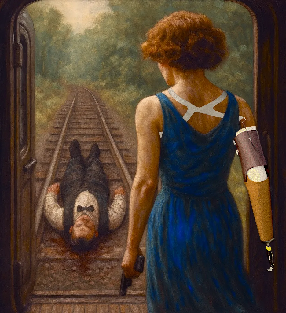 We bereikten hem in het achterste compartiment. De cultist, inmiddels gewapend met een bebloede bijl, keek me aan met een woeste blik. Ik trok mijn pistool. Hij hief de bijl — en ik vuurde. De kogel trof hem niet dodelijk, maar voldoende. Hij deinsde achteruit, wankelde tegen de deur… en die deur, wellicht niet goed gesloten, gaf mee. Hij viel achterover, uit de trein, op de rails. Ik haastte me naar het portaal. Daar lag hij. Onbeweeglijk, zijn hoofd in een steeds breder wordende plas bloed, de Oriënt Express achterlatend als een stomme getuige.