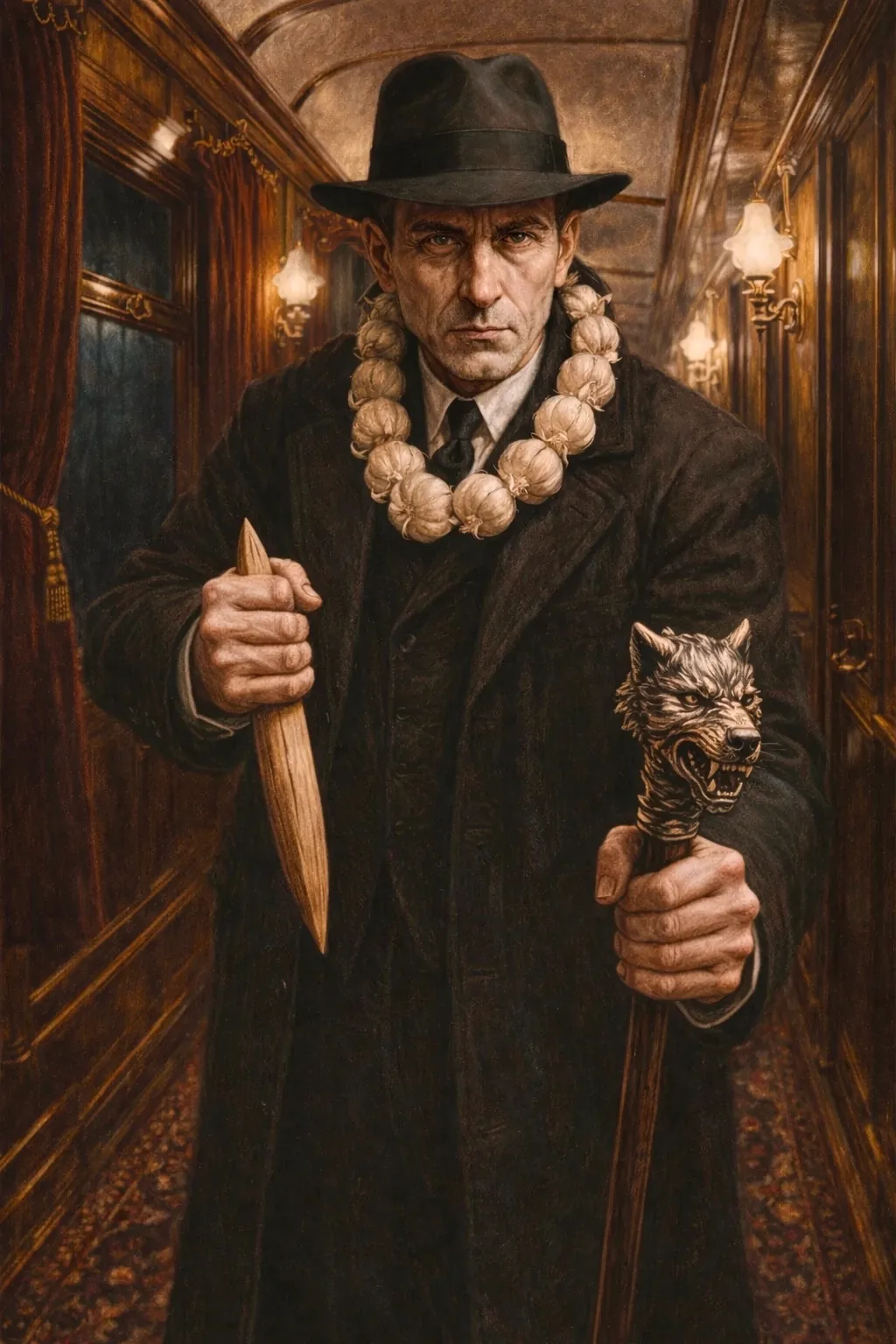 Voordat we aan boord van de Orient Express gingen, hadden we — naast enkele uren slaap — vrijwel alle knoflook uit de hotelkeuken meegenomen. Daarnaast hadden we een aantal houten staken geslepen tot vlijmscherpe punten. Eén daarvan was voorzien van schroefdraad, zodat ik hem op mijn prothese kon bevestigen.
