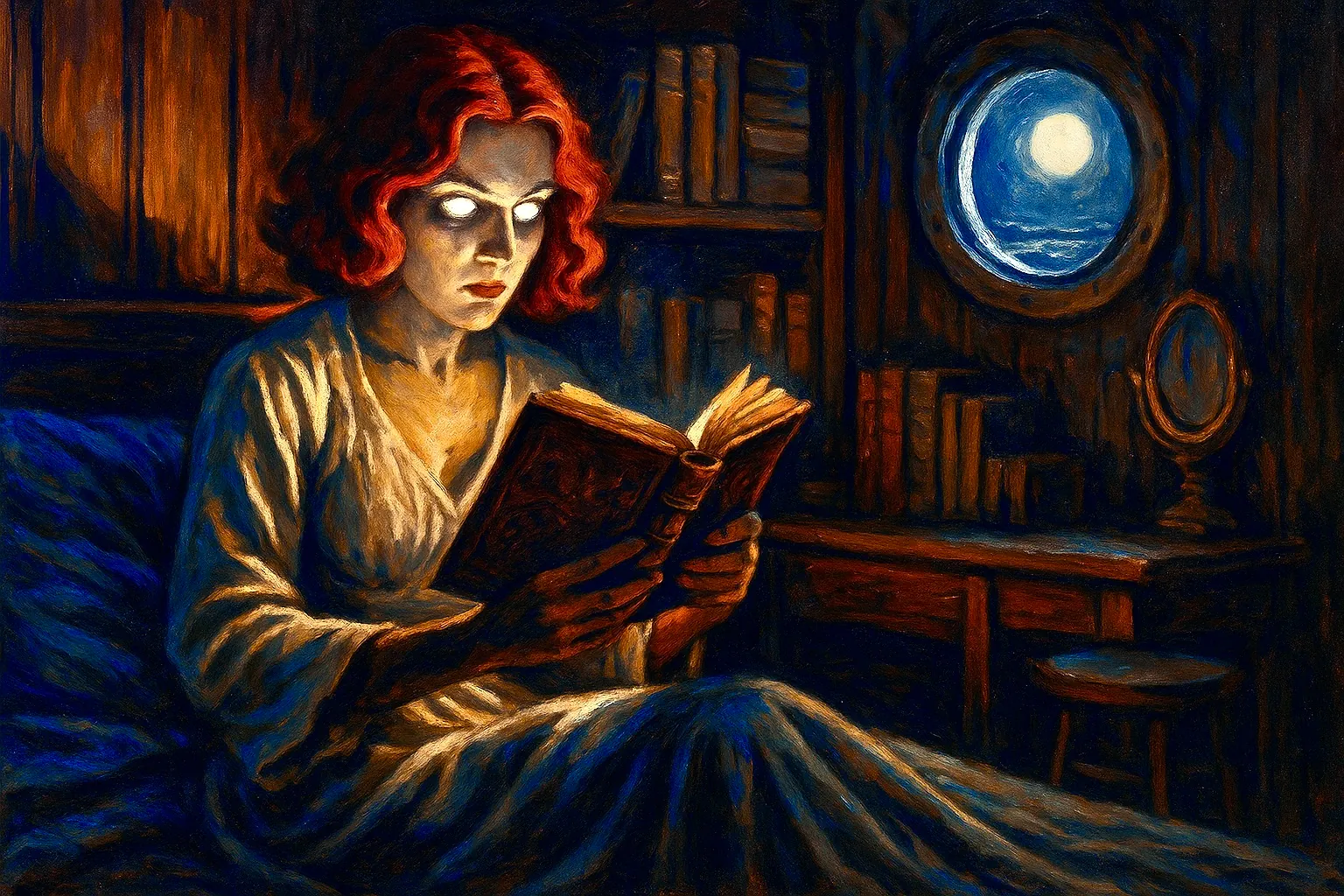 "Sinds zij dat vervloekte boek in haar bezit heeft, is Dolores bij vlagen onherkenbaar. Ze spreekt opeens in het Duits — een taal die zij naar mijn weten niet beheerst — en lijkt in staat het boek moeiteloos te lezen, zelfs bij volslagen duisternis. Ik zie het gebeuren, en voel mij volkomen machteloos."