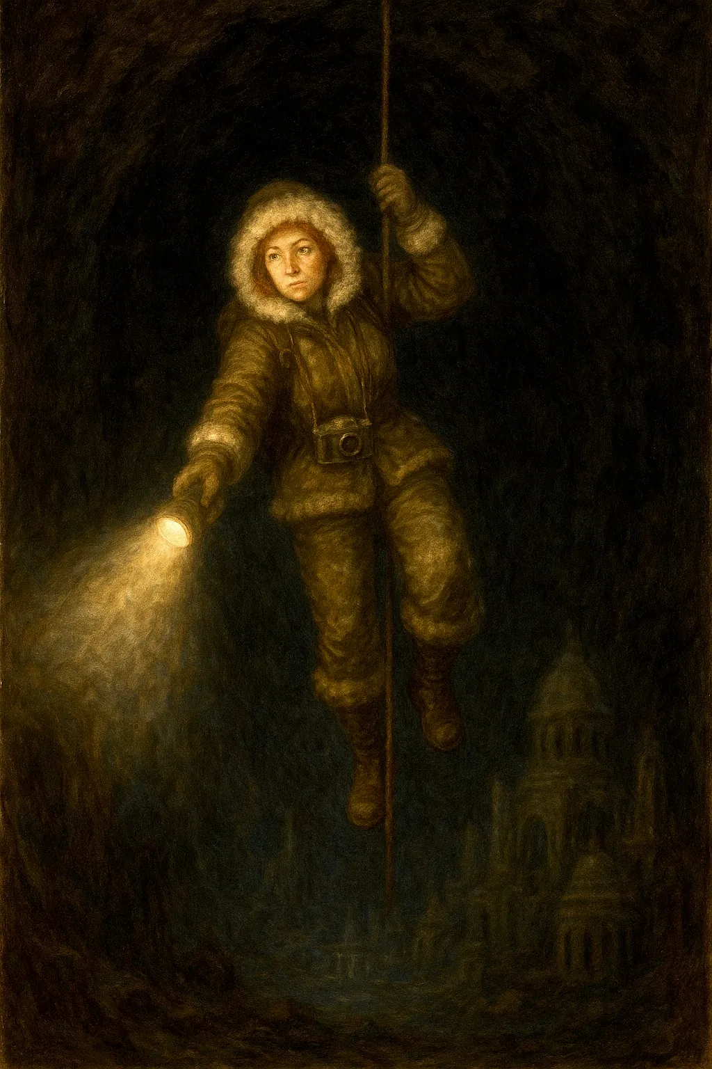 "Binnen, bij ons geïmproviseerde kamp, hadden Dolores en Bernardus een opening in het ijs gemaakt. We ontdekten daaronder een immense ruimte, verstild en hongerig, wachtend op onze aanwezigheid. Toen Dolores beweging meende te zien in de schaduwen, trokken wij haar snel terug omhoog. Ik kon de angst in haar ogen lezen; misschien weerspiegelde die ook de mijne."