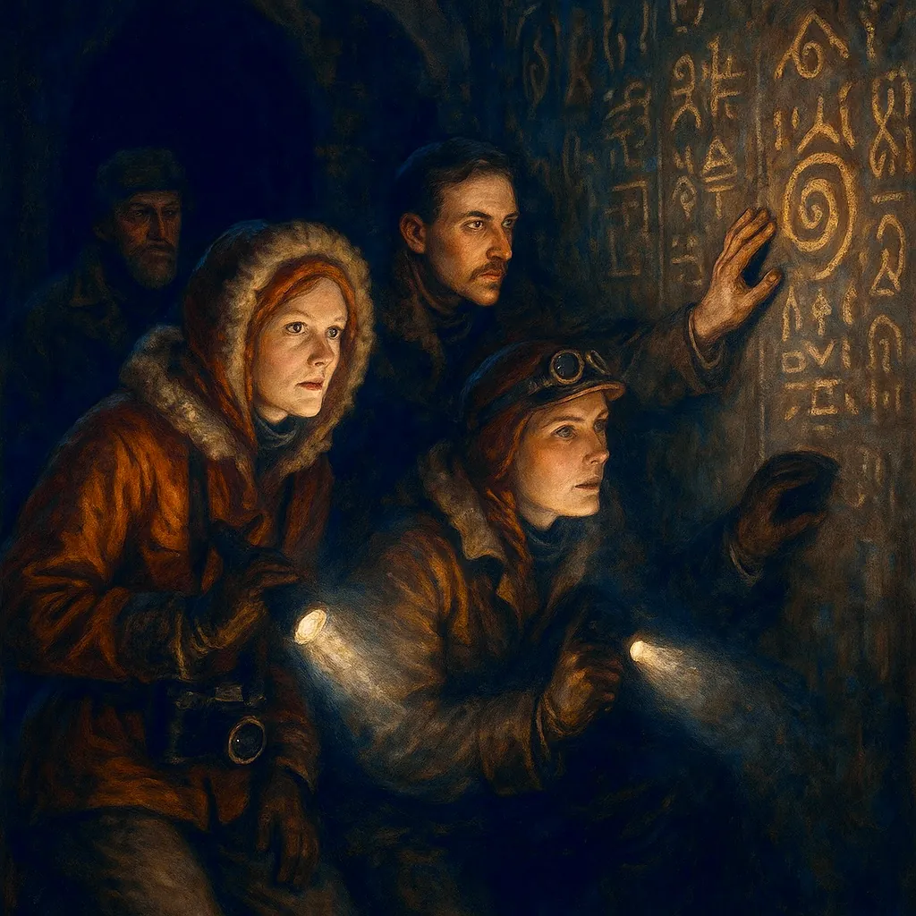 "Verderop buiten vonden we een andere kamer, de muren bedekt met hiërogliefen die fluisterden over de geschiedenis van deze plek. Het vertelde over de Elder Things en hun gruwelijke schepsels, de shoggoths, alsof de stenen zelf nog herinnerden aan wat hier ooit leefde en heerste."