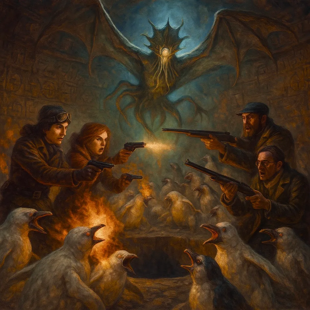 "Tijdens een verdere verkenning onder de stad werden we plots omringd door groteske, enorme albino pinguïns – blind, maar huiveringwekkend in hun aanwezigheid. In de chaos die volgde, werden we compleet verrast door een nog levend Elder Thing dat opsteeg uit de diepte… en ons aanviel. Het gevecht was hectisch en wanhopig. We wonnen, maar met elke slag werd de zekerheid groter: er zijn hier niet welkom."