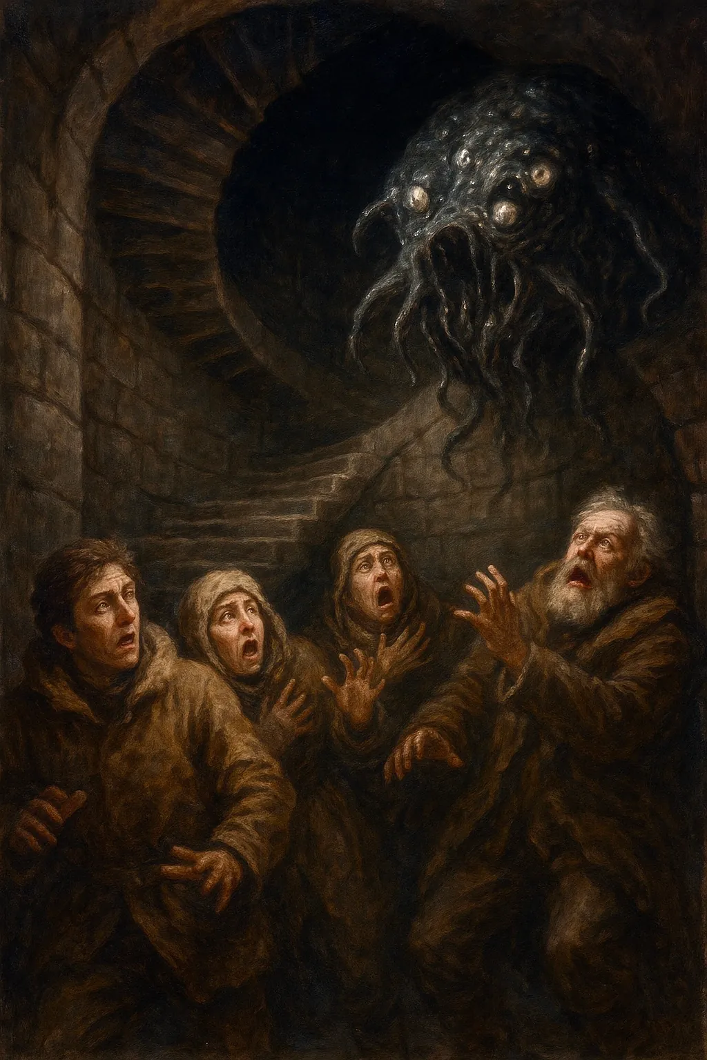 "Alsof dat niet genoeg was, troffen we bij onze terugtocht naar de oppervlakte iets dat nog veel erger was. Een shoggoth, een wezen uit een nachtmerrie. Het blokkeerde het pad en viel ons onmiddellijk aan. We vochten als wilden, maar weinig leek het monster te deren. Bernardus werd zwaar verwond, en ik dacht dat we daar allemaal zouden sterven. Maar dynamiet bleek onze redding. We overleefden we het… net."
