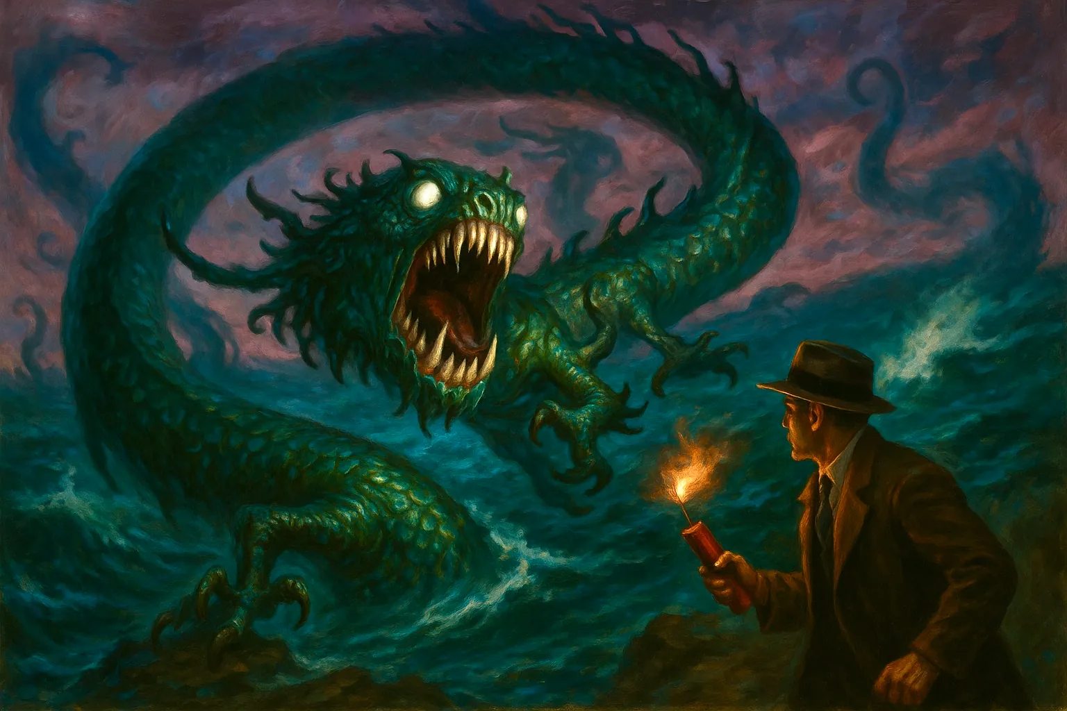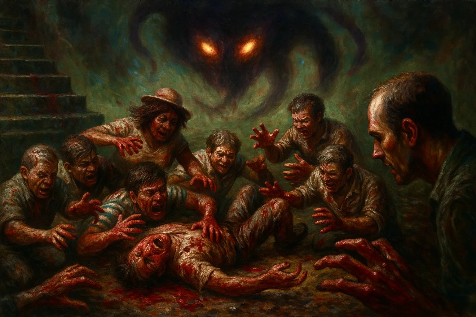 We werden getuige van het ritueel—of beter gezegd, een orgie vermomd als ceremonie. Mannen en vrouwen in extase, verslonden van waanzin, namen letterlijk en figuurlijk happen vlees uit elkaar. Een grotesk tafereel van kannibalisme en extase, culminerend in de aanroeping van een entiteit die eruit zag als een soort... draak? Later leerden we de ware naam van het wezen: een Lloigor.
