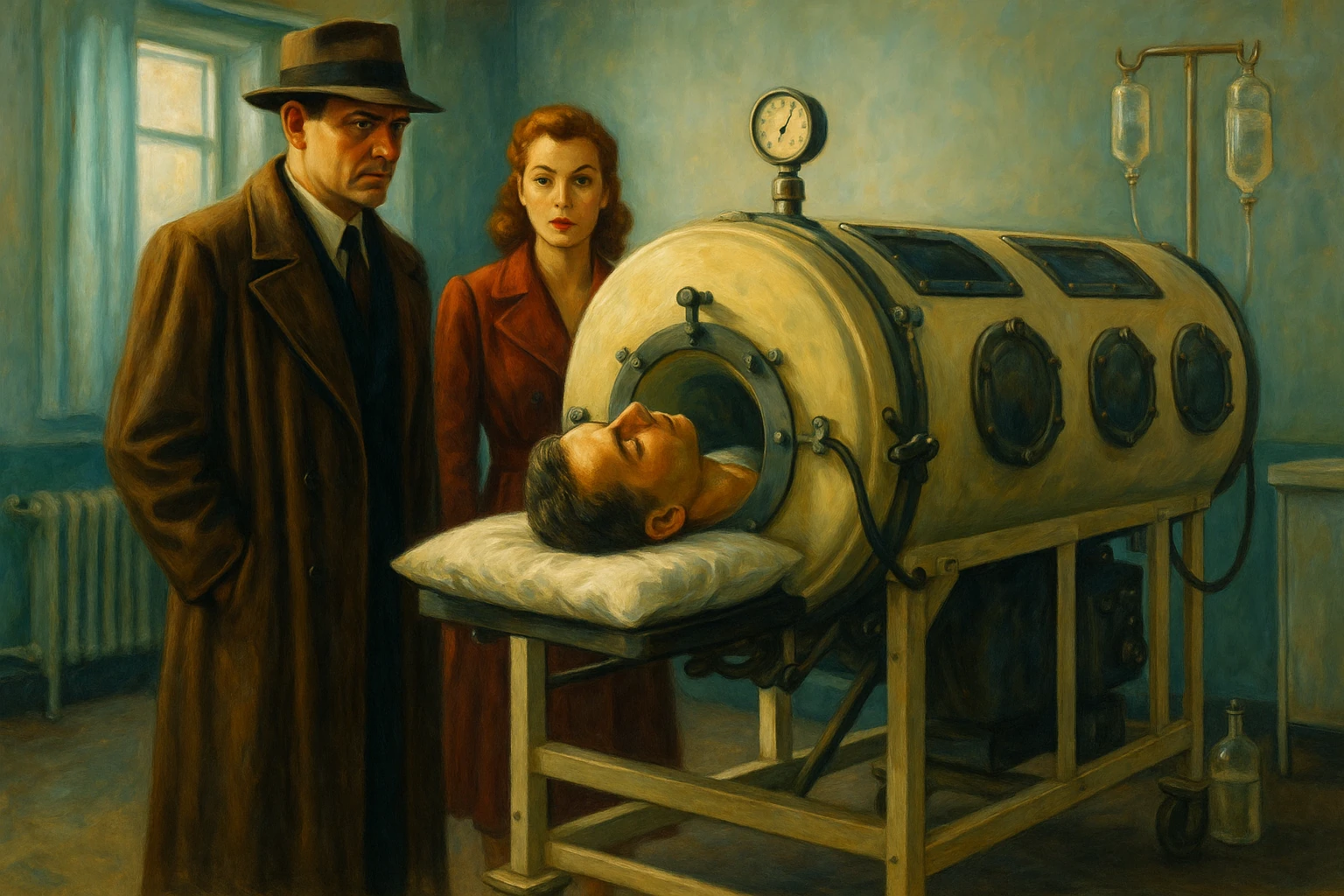 Bij aankomst in het hospitaal werd ik geleid naar een somber verlichte kamer, waar de geur van antiseptica en verval samensmolten tot een atmosfeer van dood en wanhoop. Daar lag Rupert, gevangen in een grotesk apparaat van ijzer en rubber, een 'ijzeren long' die met mechanische regelmaat zijn ademhaling overnam. Naast een bleke zuster en een zwijgzame arts stond een man die ik niet kende. Hij was lang, met een scherp, aristocratisch gezicht, en droeg een oude, ietwat versleten lange jas die sporen van lange omzwervingen verried. Hij stelde zich voor met een naam die bijna bovennatuurlijk overkwam: Klaus Freihart von Grabräuber.