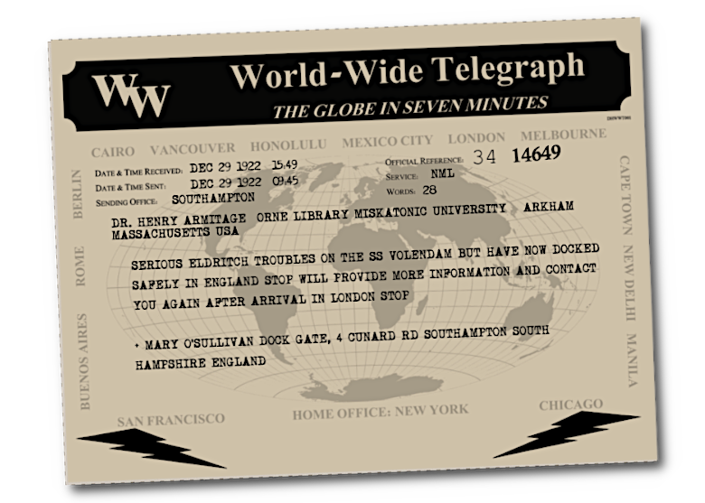 De overtocht over de Atlantische Oceaan was verre van kalm en vredig, om het zacht uit te drukken. Niettemin, hier zijn we dan. Na onze aankomst in Southampton, besloot ik onmiddellijk een telegram te versturen naar Dr. Armitage. Niet zozeer om hem te laten weten dat ik veilig en wel in Engeland ben aangekomen, maar eerder om hem te informeren over wat Klaus en ik tijdens de helse reis hadden gezien en doorstaan. Immers, wat we onderweg meemaakten, zal hem zonder twijfel meer interesseren dan mijn persoonlijke welzijn.