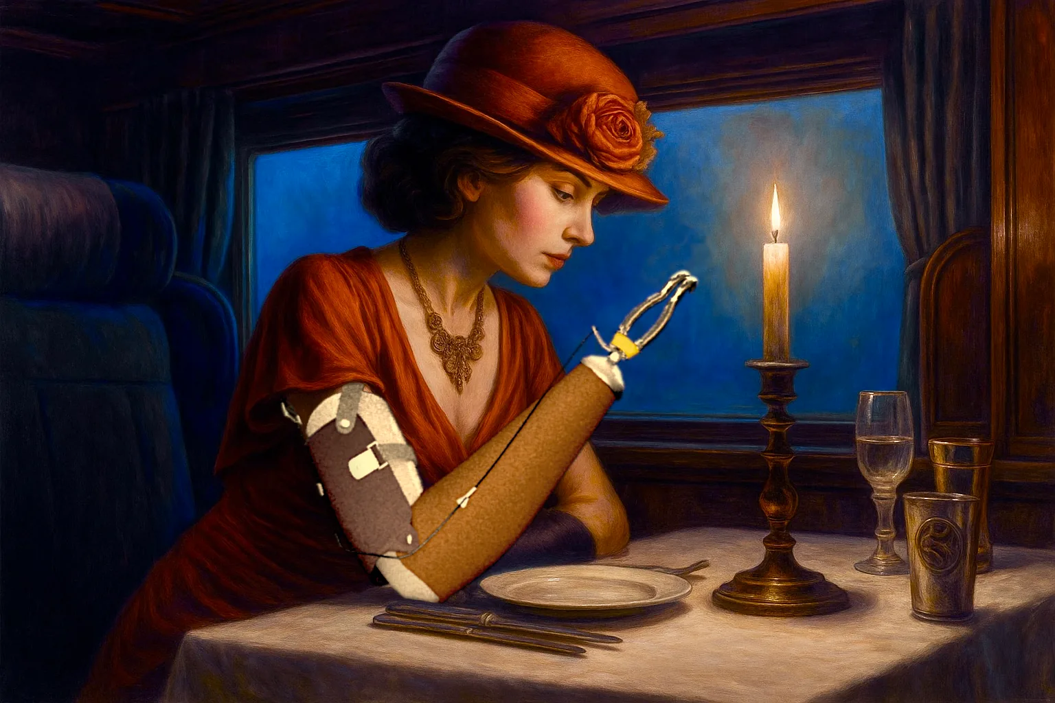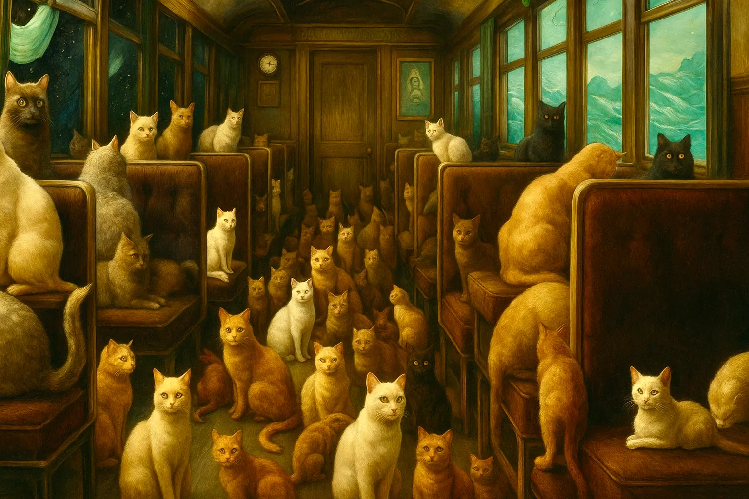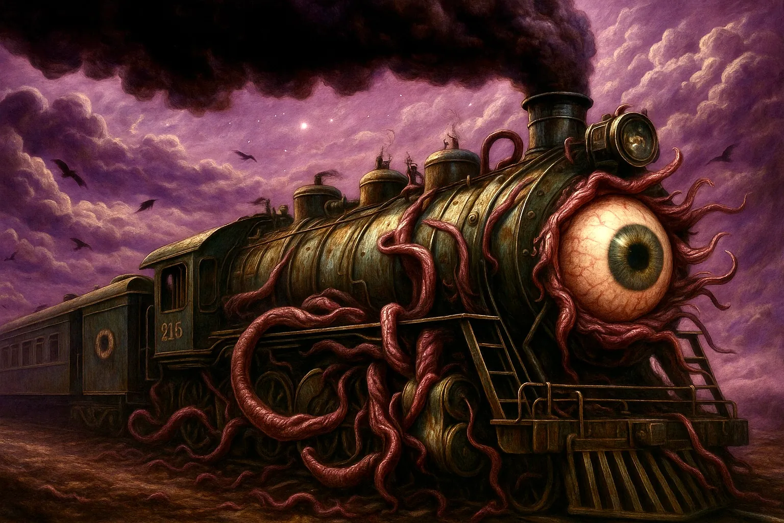 Maar voordat we verder konden ontdekken welke specifieke angsten de andere passagiers bij zich droegen, arriveerde de Dreamlands Express. En dat was een tamelijk gruwelijk schouwspel. De trein zag er oppervlakkig uit als de Orient Express, maar dan ontsproten uit de nachtmerrie van een verknipte geest, met een rood, bloeddoorlopen oog als koplamp, krioelend van de tentakels en zich voortbewegend op korte beentjes in plaats van wielen. Het ontbreken van een spoor was daarmee in ieder geval verklaard. Ieder weldenkend mens zou zich gillend uit de voeten moeten maken bij het aanschouwen van dit afgrijselijke beeld, maar in deze droomwereld voelde het ogenschijnlijk logisch en normaal. Klaus en ik gingen gewoon aan boord alsof het de normaalste zaak van de wereld was. De katten bleken hun eigen wagons te hebben.