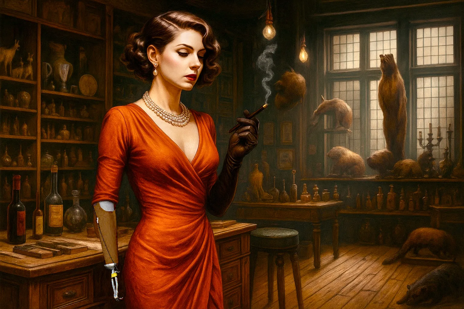 Bij het adres aangekomen belden we aan en werden vriendelijk begroet door Edgar, een keurige man van middelbare leeftijd die ons binnenliet in zijn winkel. Eenmaal binnen werden we overmand door een ongemakkelijk warm gestookt vertrek. Overal in de ruimte waren vele soorten dieren uitgestald als een vervreemdende, bijna absurde expositie. De ruimte stond vol met ornamenten met gedroogde bloemen en kruiden, die niet konden verhullen dat daaronder de bedwelmende geur hing van rottend vlees, vochtige huiden en formaldehyde.