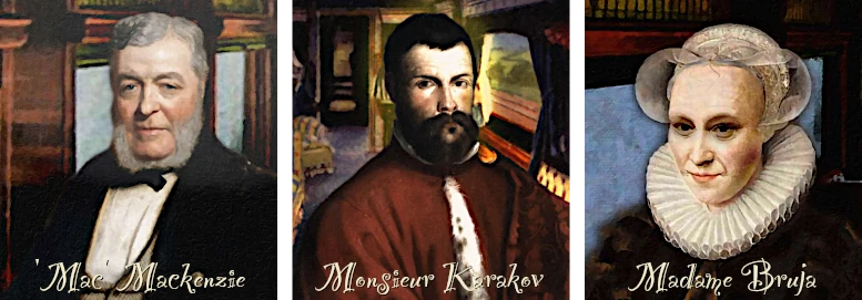 Onze aanwezigheid hier was dus niet iets eenmalig en, hoewel ik nog immer geen idee heb waarom, mogelijk derhalve daadwerkelijk belangrijk. Ik nam me dus voor om de personen die wij hier hadden ontmoet nu beter te gaan leren kennen en onthouden. Naast de (bijna griezelig attente) Belgische treinconducteur Henri Peeters en een groot aantal katten (waaronder de aanhankelijke Blackjack) waren er drie mensen tegelijk met ons aan boord gekomen: ‘Mac’ Mackenzie, Monsieur Karakov en Madame Bruja.