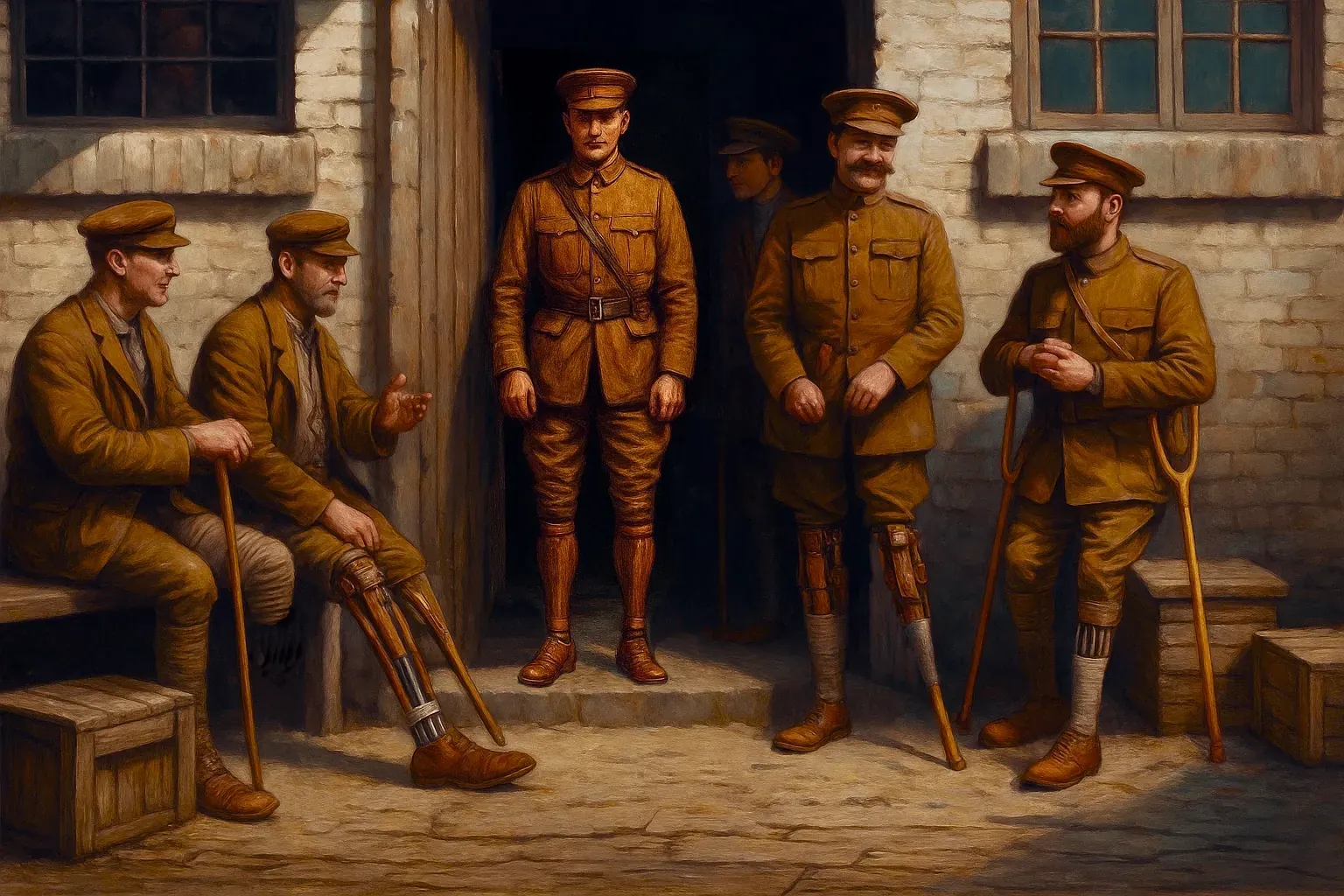 Het spoor naar het gezochte artefact leidde naar deze familie, die al eeuwen actief is als makers van poppen. De verschrikkingen van de oorlog en de voortschrijdende techniek had er in de afgelopen jaren voor gezorgd dat ze hun vakmanschap nu vooral inzetten voor andere doeleinden: het vervaardigheden van protheses. Evenals in mijn eigen thuisland zijn er in Italië namelijk vele soldaten teruggekeerd vanuit de loopgraven die ledematen moeten missen als gevolg van de gruwelen van de oorlog. Dit gegeven heeft gezorgd voor een grote innovatieve impuls op het gebied van protheses, waar ik zelf ook van profiteer. Bij aankomst bij de werkplaats zagen we verschillende veteranen met kunstmatige ledematen welke zich in kwaliteit prima konden meten met onze Amerikaanse producten.