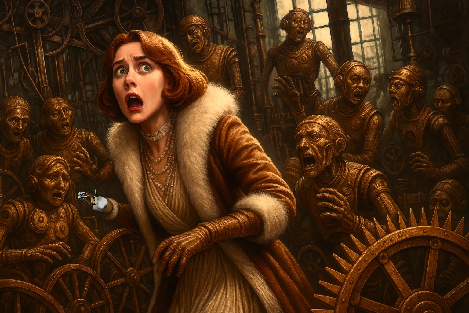 We bevonden ons daarna in een donkere ruimte. Dankzij onze zaklampen konden we zien dat het hier vergeven was van raderwerken, tandwielen, loopbanden en talloze andere onderdelen die de klok en de beeldenparade mogelijk maakten. En de acht automaten dus, waarvan er een uitgerust was met het vervloekte artefact. Een van de figuren bleek een leeuw, dus bleven er zeven beelden over om te onderzoeken. Alle bleken te zijn voorzien van een koperen laag, dus op het oog was het gezochte been niet direct te herkennen.