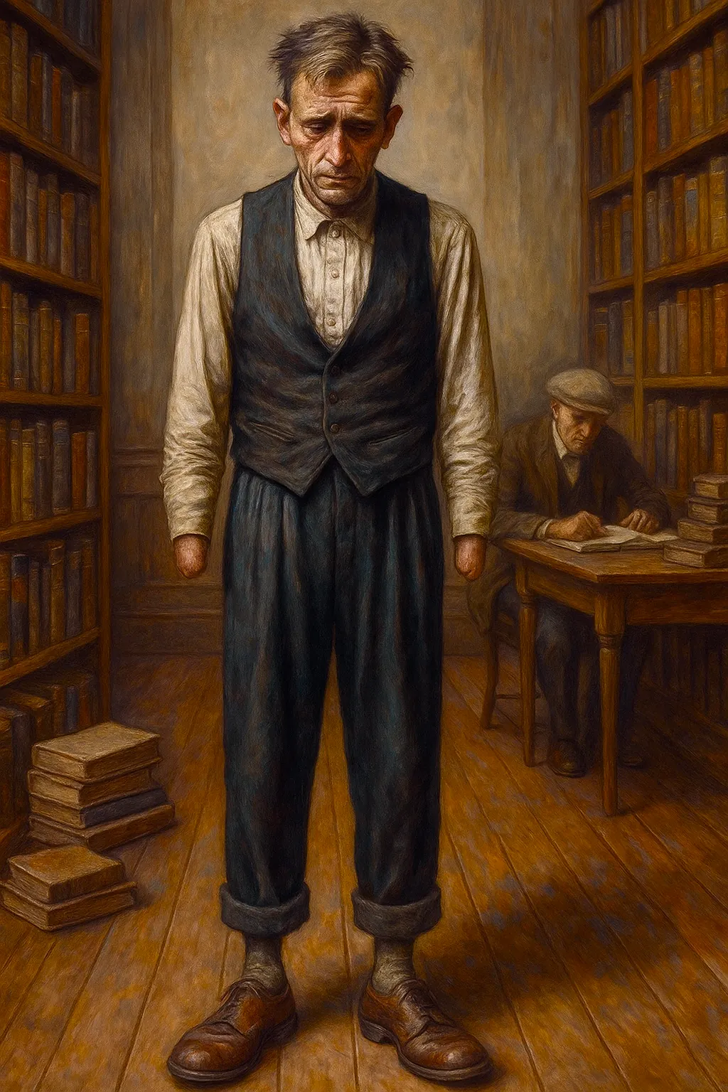Met deze nieuwe kennis in ons bezit togen we wederom naar de bibliotheek voor aanvullend onderzoek. Daar ontmoetten we opnieuw de mysterieuze man zonder handen en, zo bleek, ook geen tong. In tegenstelling tot onze eerdere ontmoeting, zocht hij nu wel contact. Sterker nog: hij verzocht ons hem te volgen. Naar zijn huis, zo bleek, of eerder een bouwval waar hij zijn toevlucht nam. We leerden dat zijn naam Helmut Grossinger was en, in het verleden, net als wij, een onderzoeker was naar het occulte. Zijn handen en tong waren hem jaren geleden als straf ontnomen door die vervloekte lloigor cultus hier in de stad. Zijn handen leken wel te zijn weggesmolten. Arme man.