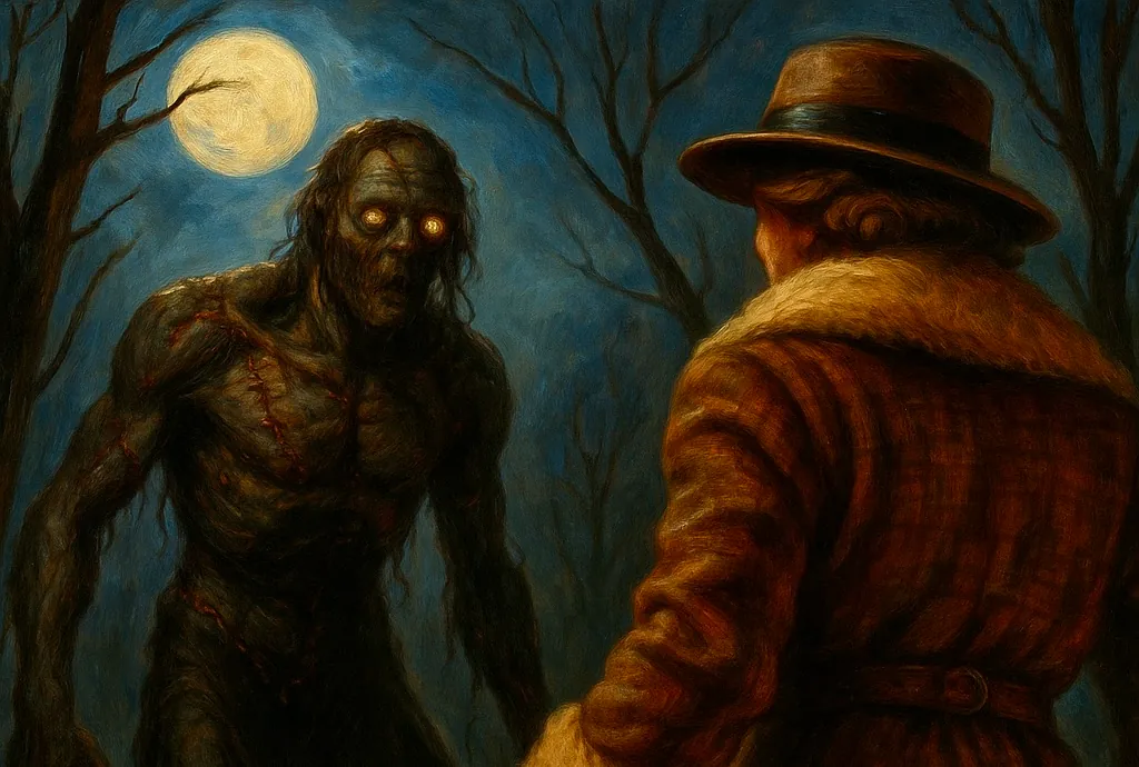 Op de terugweg echter, op enkele honderden meters van het complex van dokter Belenzada, kwam er plots een monsterlijke gedaante uit het bos op ons afrennen. Het wezen had een menselijke gestalte, maar een mens was het zeker niet. Het bleek een onheilige samensmelting van dierlijke en menselijke ledematen. En het was vijandig, zeer vijandig. En sterk. Pistoolkogels leken het weinig te deren en pas na drie dynamietstaven van Klaus en mijn meest machtige bezwering zakte het wezen levenloos ineen.