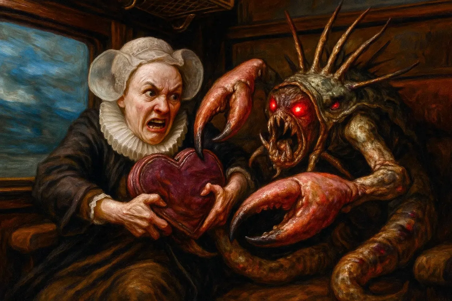Hij zette het op een lopen. Klaus, Henri en ik achter hem aan, als toneelspelers in een grotesk stuk. De achtervolging eindigde in de coupé van mevrouw Bruja. Toen wij de deur openden, verdween elke twijfel—Mironim-Mer had zijn ware gedaante aangenomen. Niet menselijk, niet dierlijk—maar een krabachtig, tentakelig wezen, een nachtmerrie van chitine en kaken, dat zich op mevrouw Bruja stortte en haar hartvormige tasje trachtte te bemachtigen.
