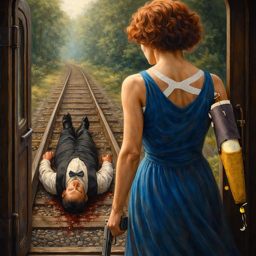 We bereikten hem in het achterste compartiment. De cultist, inmiddels gewapend met een bebloede bijl, keek me aan met een woeste blik. Ik trok mijn pistool. Hij hief de bijl — en ik vuurde. De kogel trof hem niet dodelijk, maar voldoende. Hij deinsde achteruit, wankelde tegen de deur… en die deur, wellicht niet goed gesloten, gaf mee. Hij viel achterover, uit de trein, op de rails. Ik haastte me naar het portaal. Daar lag hij. Onbeweeglijk, zijn hoofd in een steeds breder wordende plas bloed, de Oriënt Express achterlatend als een stomme getuige.