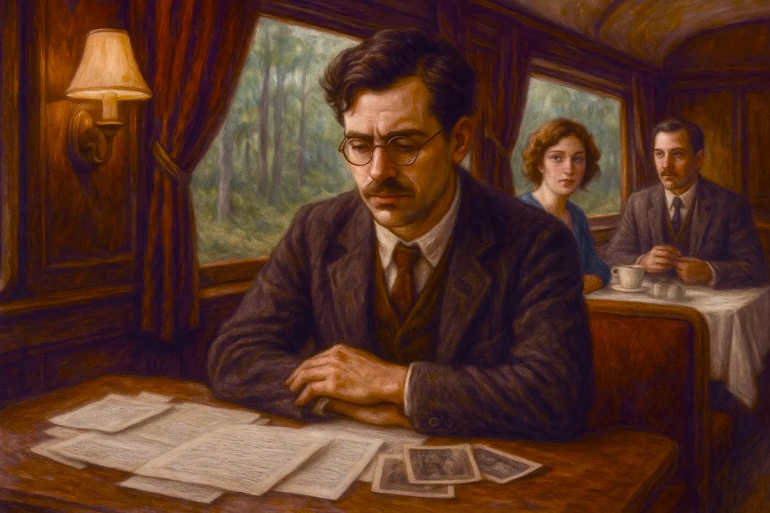 Maar… de trein keek en luisterde mee. We hadden het gevoel al langer, maar ook ditmaal werden we niet teleurgesteld. Een kelner toonde opvallend veel belangstelling voor onze conversatie, zijn ogen glipten telkens over de papieren, over ons. Toen ik hem confronterend aankeek, verstarde hij. Iets in zijn houding verschoot, en hij draaide zich abrupt om — als een betrapte dief.