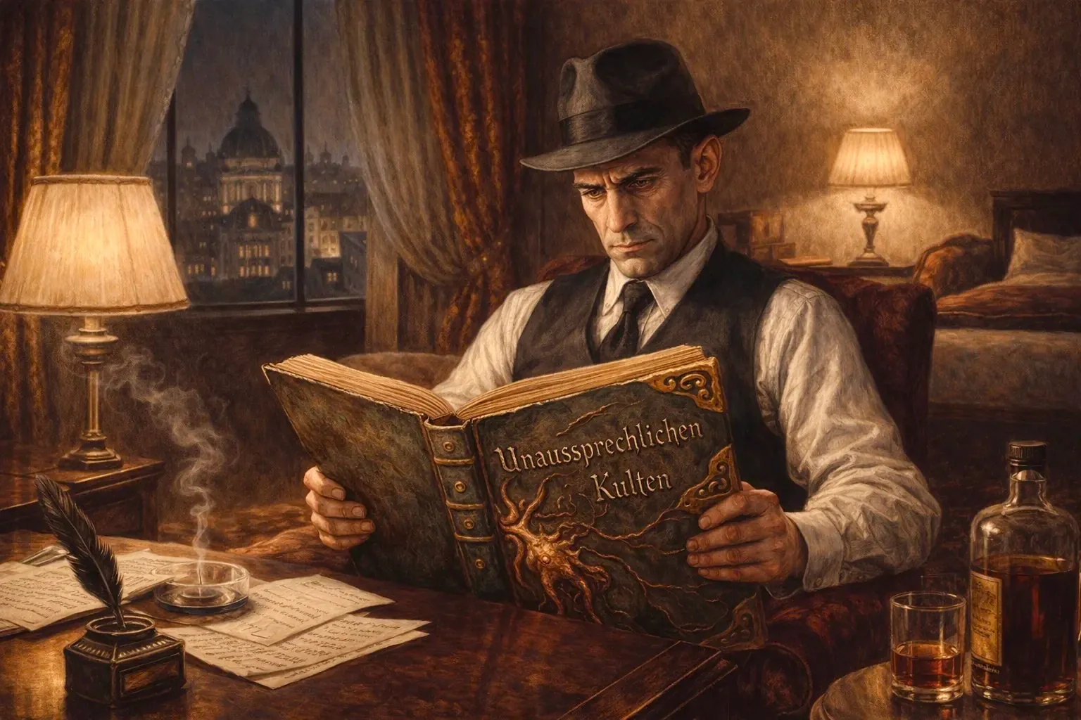 Mogelijk bevat Unaussprechlichen Kulten kennis die ons verder kan helpen. Klaus besteedt de laatste dagen veel tijd aan het bestuderen van dat verdoemde boek; wellicht levert het ons bruikbare inzichten op. Zelf probeer ik terughoudend te zijn met het gebruik van mijn blasfemische magie, daar ik merk hoe mijn verstand met regelmaat wankelt onder de fluisteringen in mijn hoofd. Maar kan ik mij die voorzichtigheid veroorloven wanneer het erop aankomt?