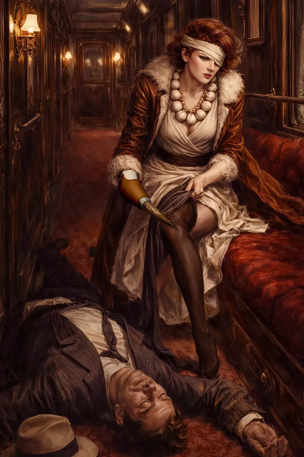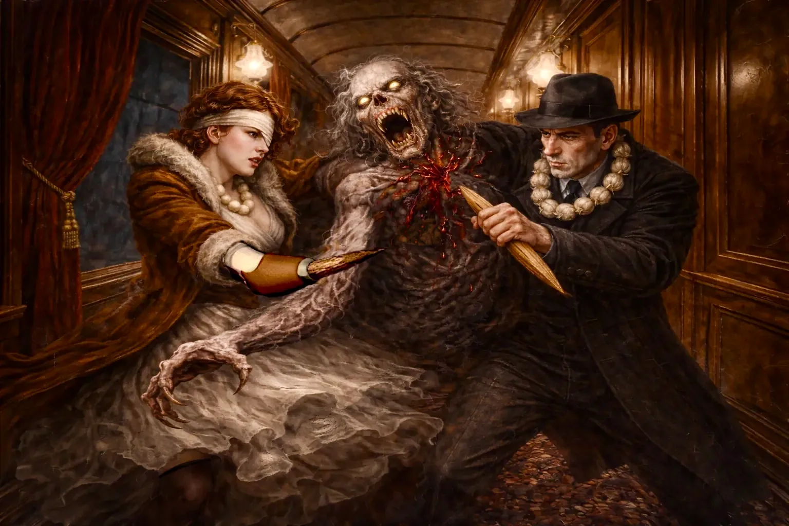 Het treinpersoneel geloofde ons gelukkig toen wij verklaarden niets met haar dood te maken te hebben. We boden aan te helpen het lichaam naar de bagagewagon te brengen, in de hoop daar alsnog Fenaliks kist te vinden. Dat betekende wel dat we onze coupé onbeheerd moesten achterlaten, vertrouwend op de knoflook bij de deur als enige bescherming.